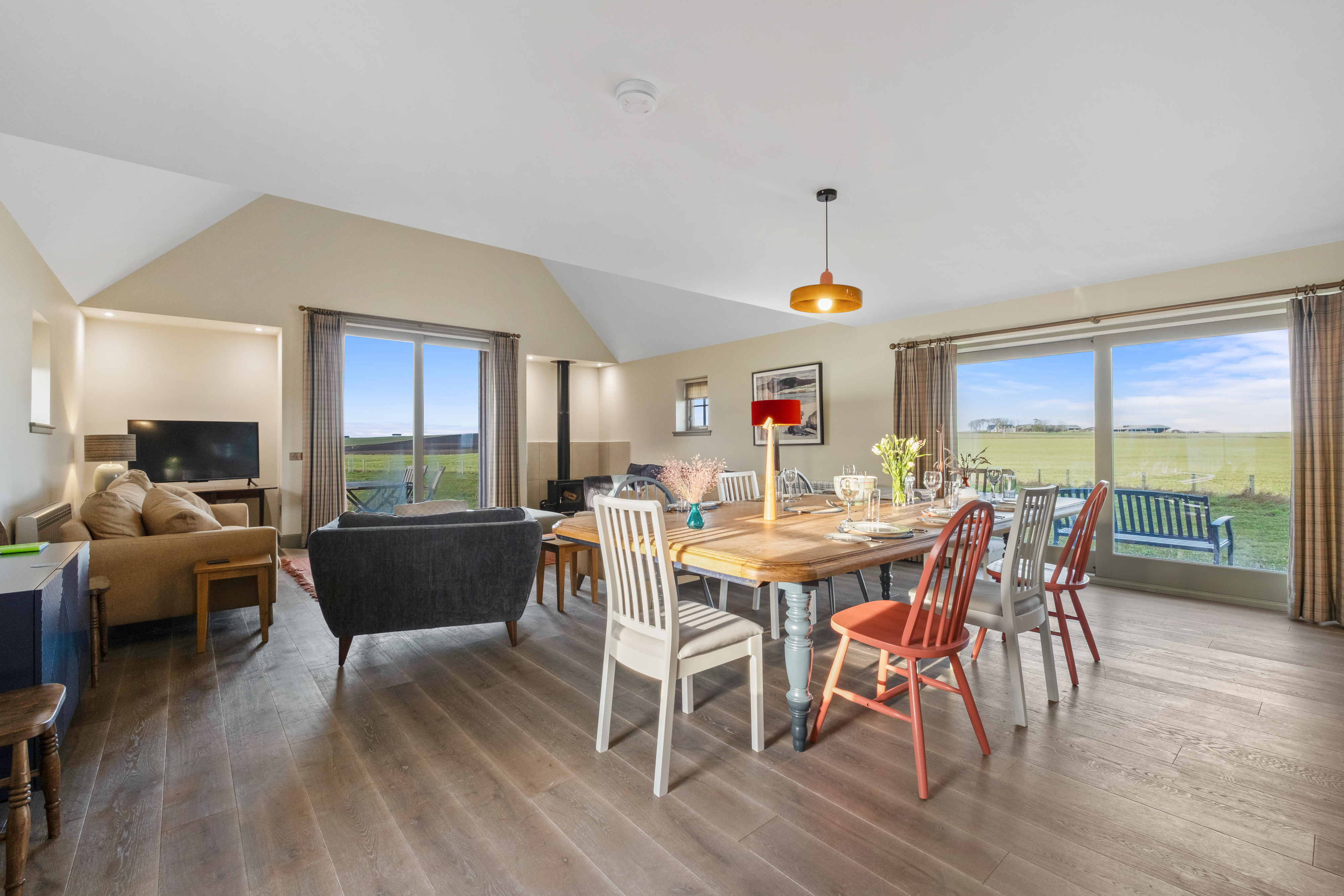 The delightful Highland holiday cottage, designed by renowned local architect Lachie Stewart, nestles in an extensive 1.75 acre plot. The most striking feature of the property is the 52m² open-plan living/dining/kitchen space with two sets of sliding glass doors giving panoramic views over the surrounding farmland. The Mandrel lies between the village of Portmahomack and the Tarbat Ness lighthouse, which towers over the landscape and is a constant backdrop to your stay.