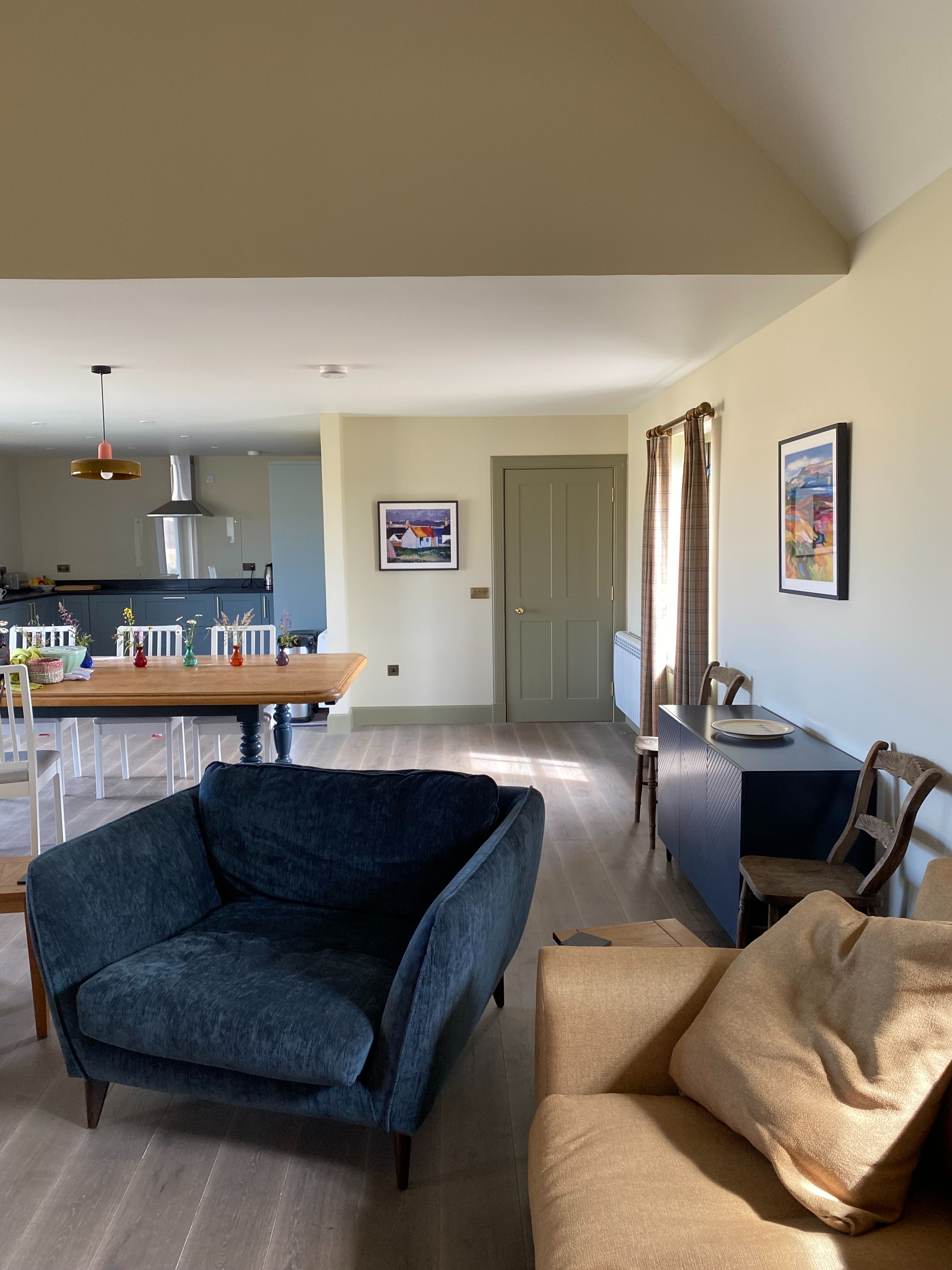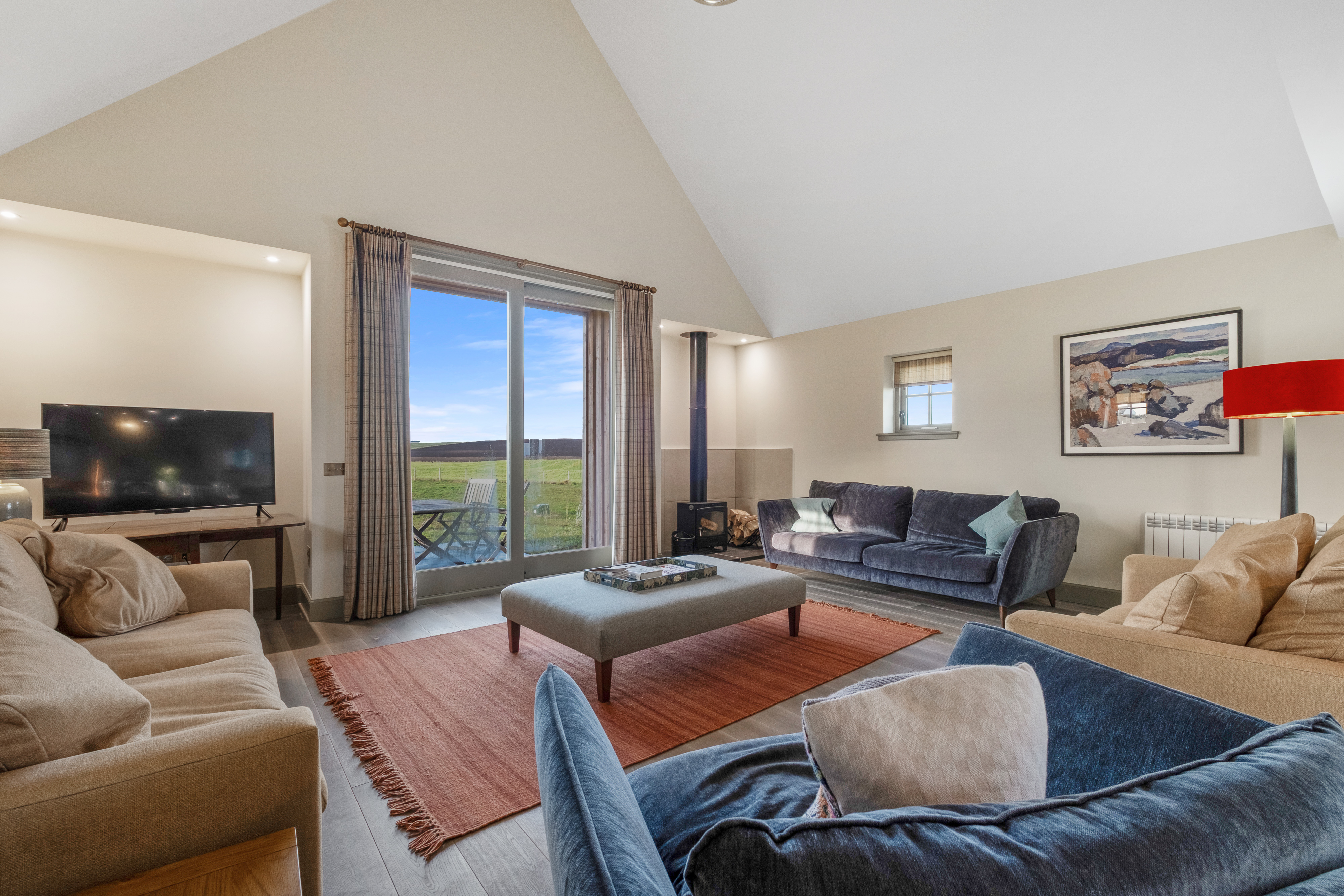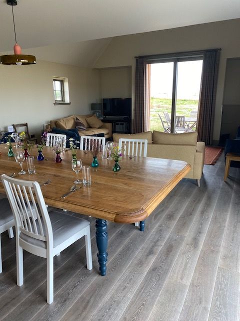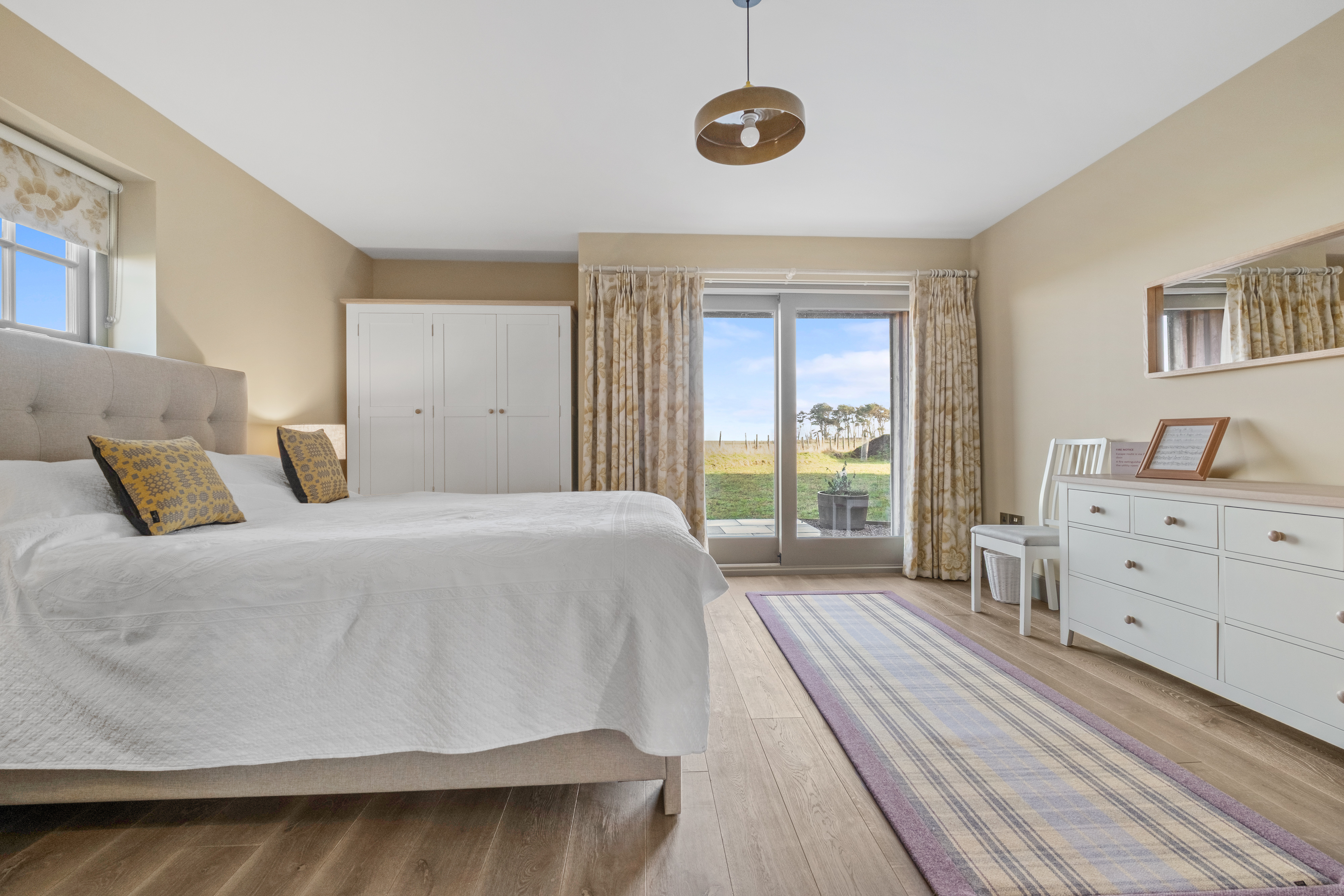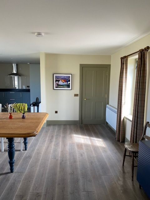 The most striking feature of the property is the 52m² open-plan living/dining/kitchen space with two sets of sliding glass doors giving panoramic views over the surrounding farmland. The interior-designed colour scheme contributes to the charm of the property. There are wood-burning stoves in the main living area and in the spacious panelled entrance hall/boot room.