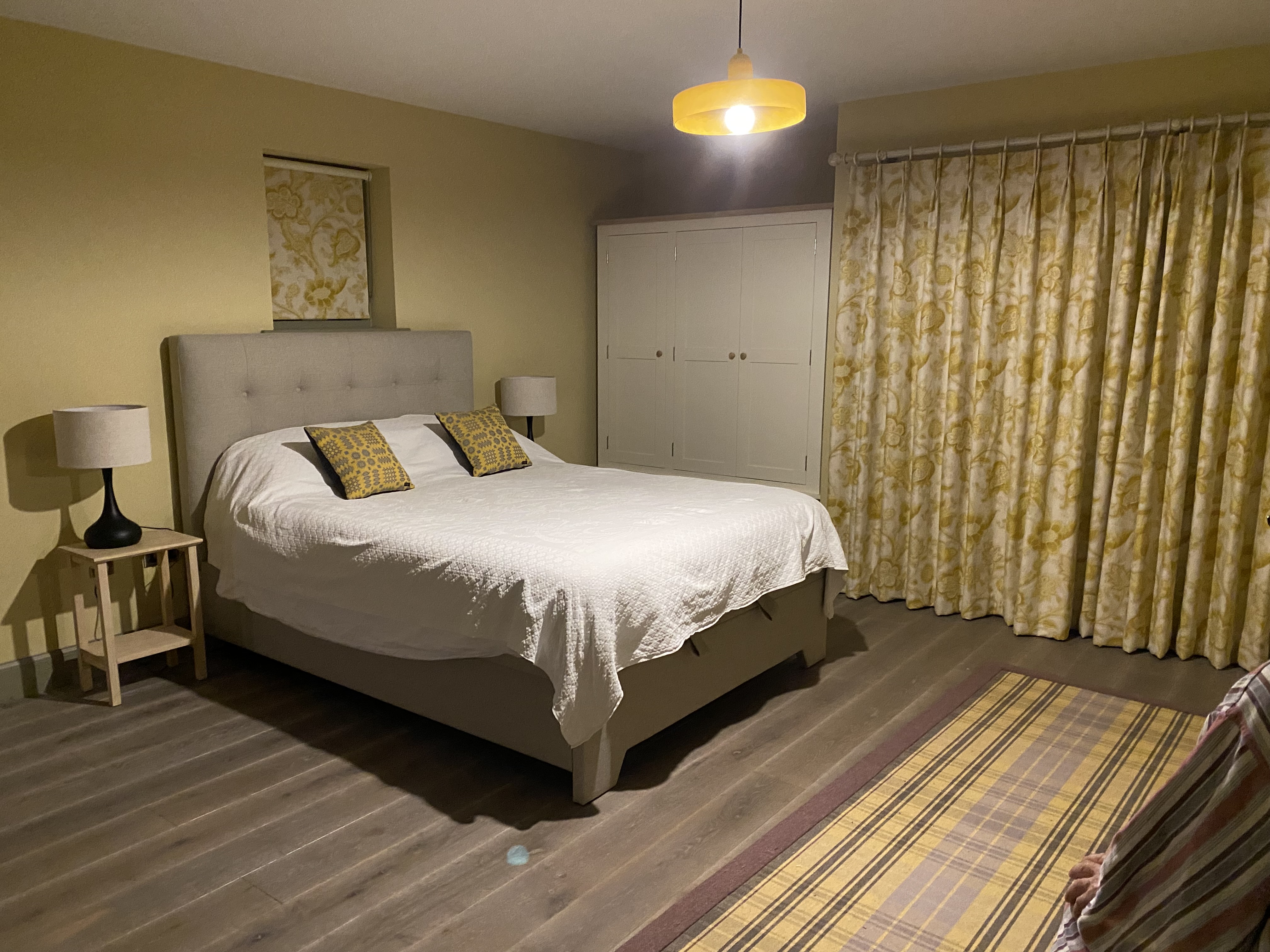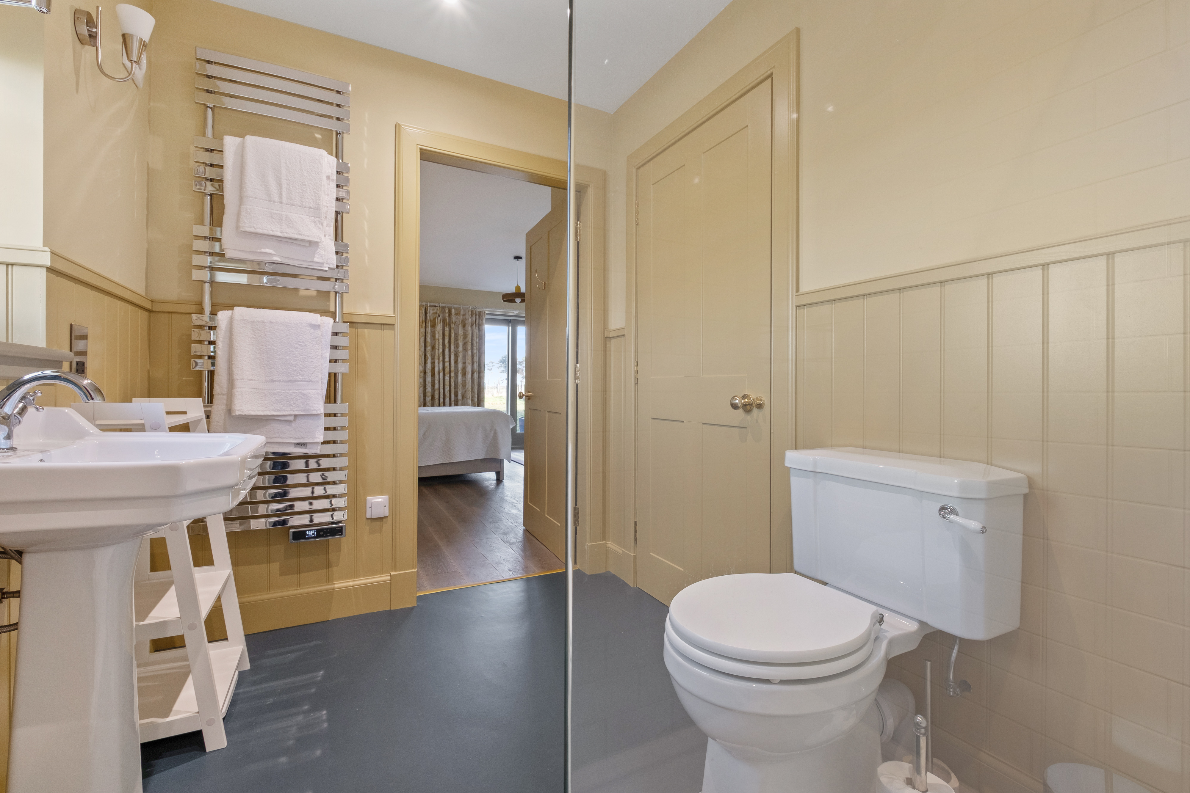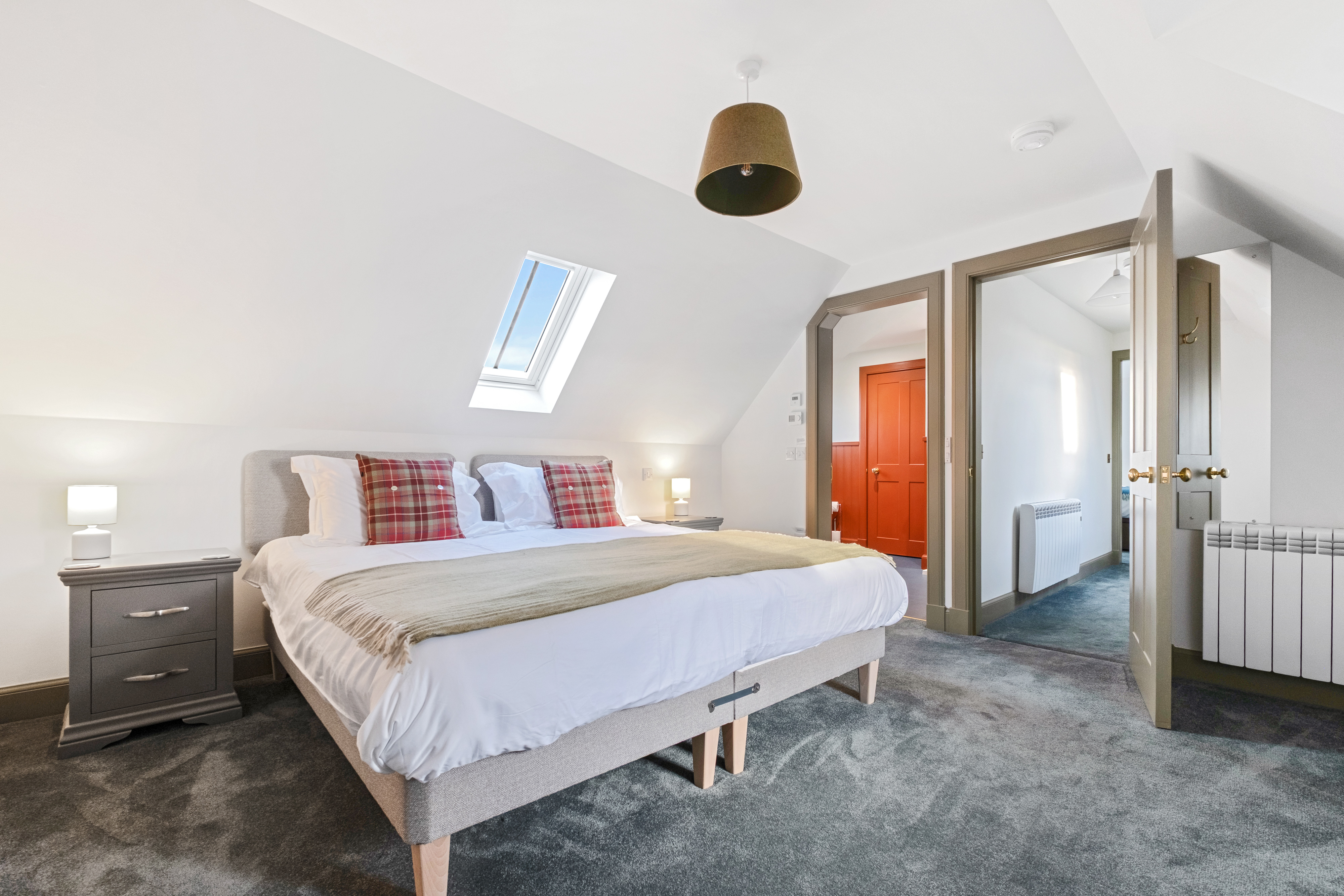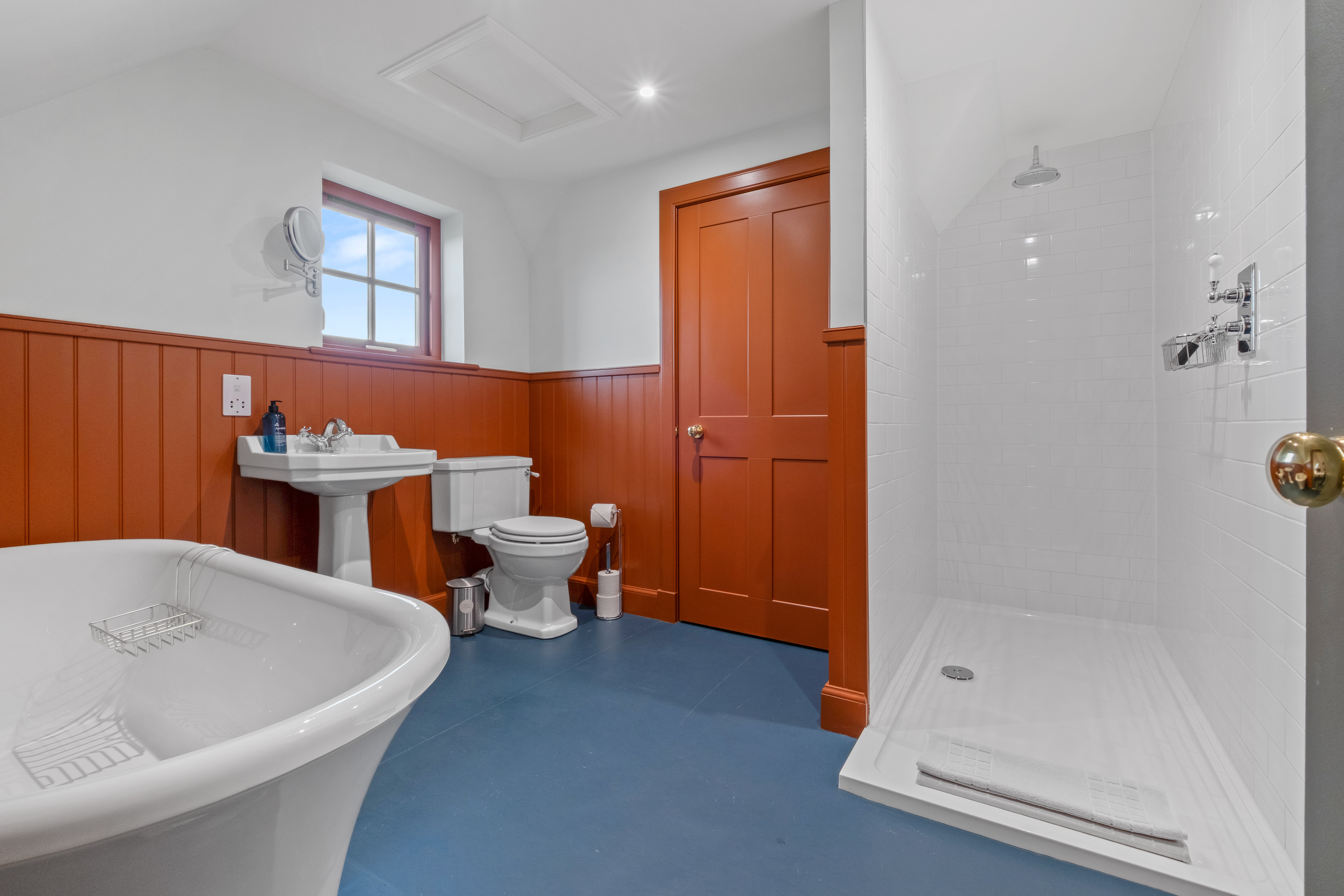 One of the upstairs bedrooms has twin beds which can be configured as a super-king. It has a large ensuite bathroom with roll-top bath and walk-in shower.